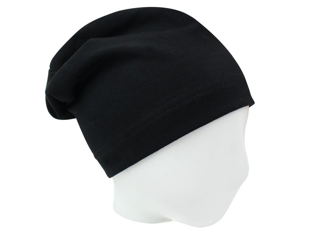 Lehká jednovrstvá dětská čepice v syté černé s prodlouženým zadním dílem (homeless střih) — moderní a pohodlná volba pro přechodová období. Materiál je měkký a prodyšný.