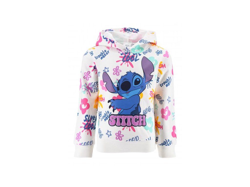 Bílý podklad s výrazným potiskem Lilo a Stitch upoutá pozornost. Potisk na světlém podkladu se snadno sladí s džíny nebo legínami a dělá z mikiny kousek, který dítě samo rádo oblékne. Design se hodí k džínům i sukním.