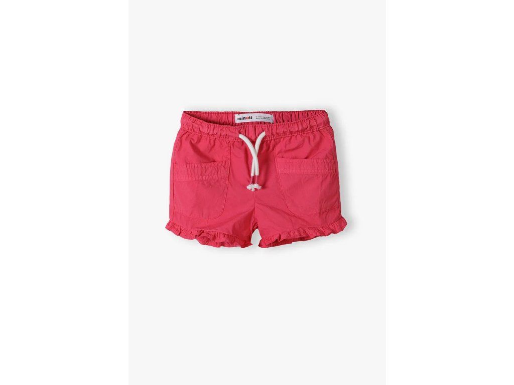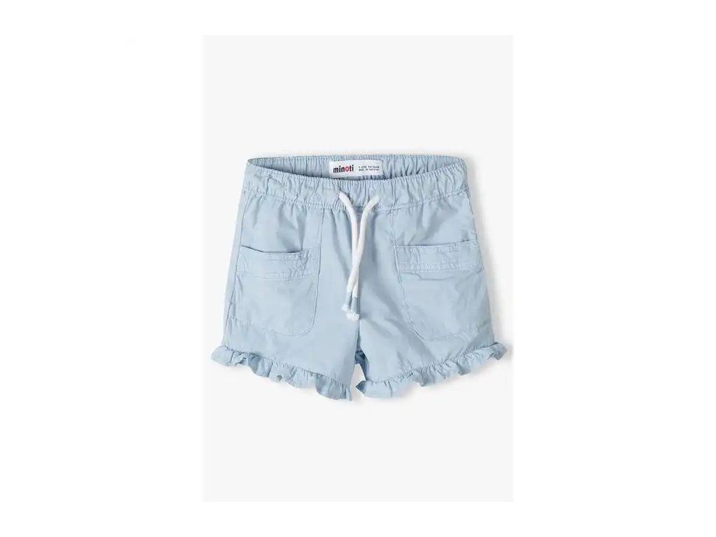 Elastický pas se šňůrkou a hladká bavlněná látka v syté modré nebo jemné růžové dominují vzhledu kraťasů. Elastický pas umožňuje snadné oblékání.