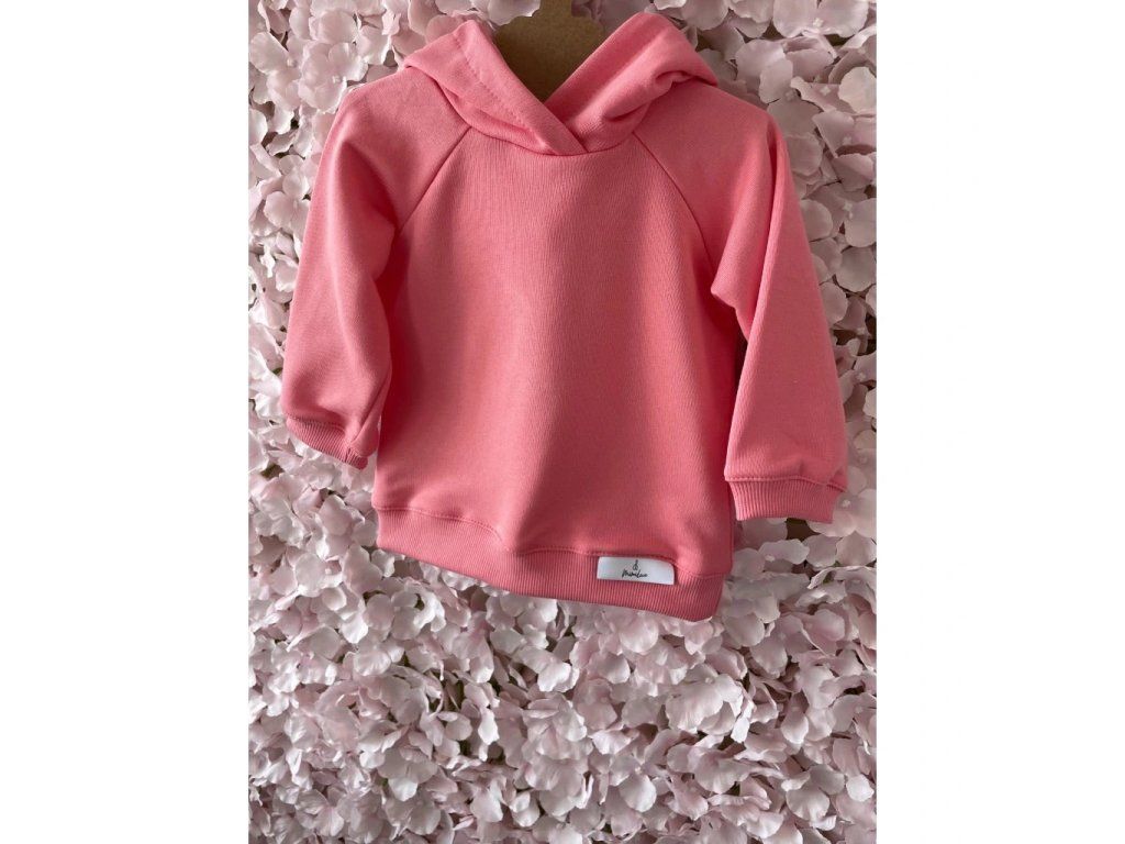 Materiál je měkký a prodyšný. Mikina je navržena pro miminka a předškoláky; dobře sedí při hraní i při delším nošení a neškrtí v pase.