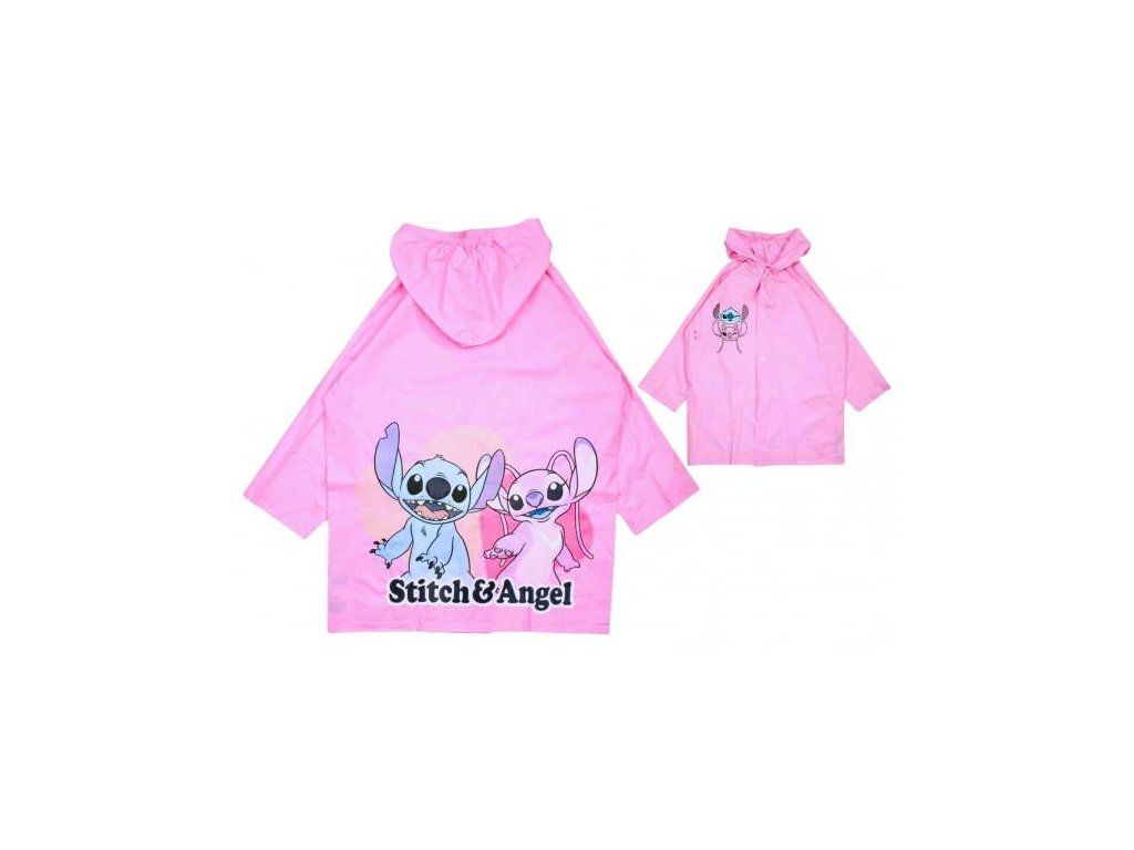 Růžová pláštěnka s nápadným potiskem Lilo a Stitch upoutá na první pohled.