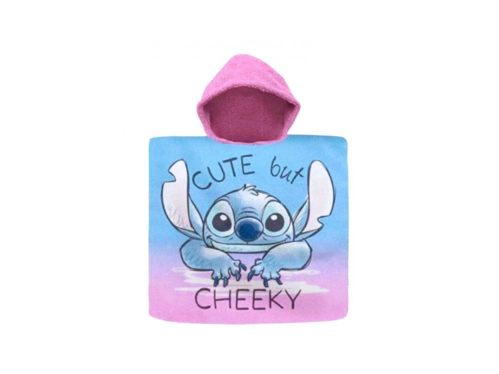 Růžovo-tyrkysové pončo s potiskem Lilo a Stitch. Tento vzor spolehlivě zaujme dětské oči i rodiče, protože barvy jsou syté a motiv je dobře čitelný z dálky.