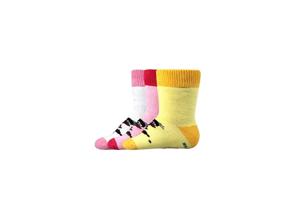 BOMA ponožky kojenecké froté KRTEČEK obrázkové DÍVČÍ (3 páry) Pro naše nejmenší jsou ponožky upletené z hřejivého bavlněného froté s podílem elastanu, takže jsou příjemné na pokožce ale zároveň jsou pružné a dobře si drží tvar. Silné ponožky mají jemný svěr lemu. Malé nožičky tak ponožky neškrtí. Obrázkové ponožky prodáváme ve výhodném balení 3 párů v mixu barev pro holčičky, které doplňuje postavička roztomilého Krtka od malíře Zdeňka Milera. z přírodní bavlny silné a teplé s oblíbeným motivem Krtečka Složení CO | bavlna 80 % PP | polypropylen 15 % EA | elastan 5 % Péče o materiál