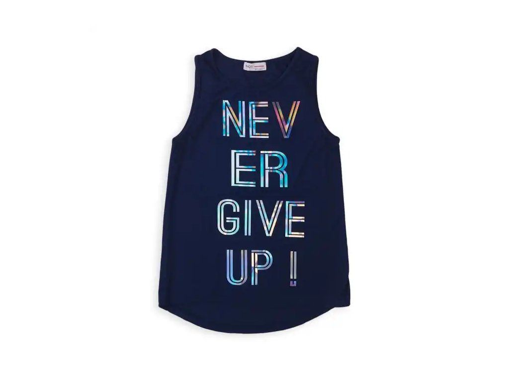 Modré tílko s výrazným nápisem "NEVER GIVE UP!" vypadá hravě a dodá sebevědomí každé malé slečně. Materiál je 100% bavlna, lehký a prodyšný, ideální na letní dny.