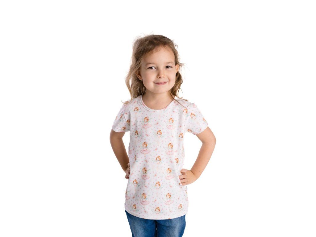 Dívčí tričko s krátkým rukávem. Velmi příjemný materiál, volný střih, pružný lem kolem krku. K tričku můžete kombinovat různé barvy legín z nabídky.
