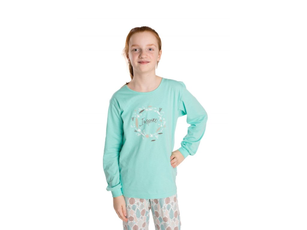 Vysoce kvalitní dívčí pyžamo vyrobené ze 100% přírodní bavlny pro maximální pohodlí a příjemný pocit na pokožce. 👧💤 Elegantní volnější střih trička i kalhot zajišťuje dostatek prostoru pro pohyb během spánku i odpočinku. Kalhoty mají celoplošný potisk s jemným motivem listů, který dodává produktu styl a hravost. 🍃🎨 U větších velikostí je kruhový výstřih na krku zakončen jemným lemem pro snadnější oblékání a lepší komfort. 👕😊