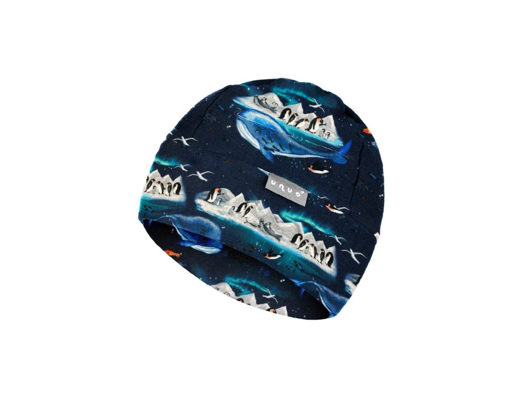Čepice je zdobená hravým motivem tučňáků na zamrzlém ledovci s doprovodem velryb a ptáků, který zaručeně potěší každého malého dobrodruha 🐧🐋.
