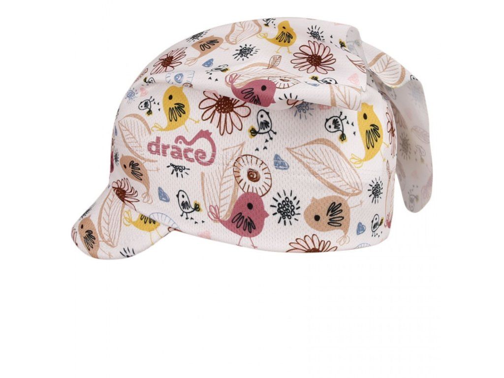 Kšilt s jemným vzorem ptáčků chrání oči a dává šátku hravý vzhled.