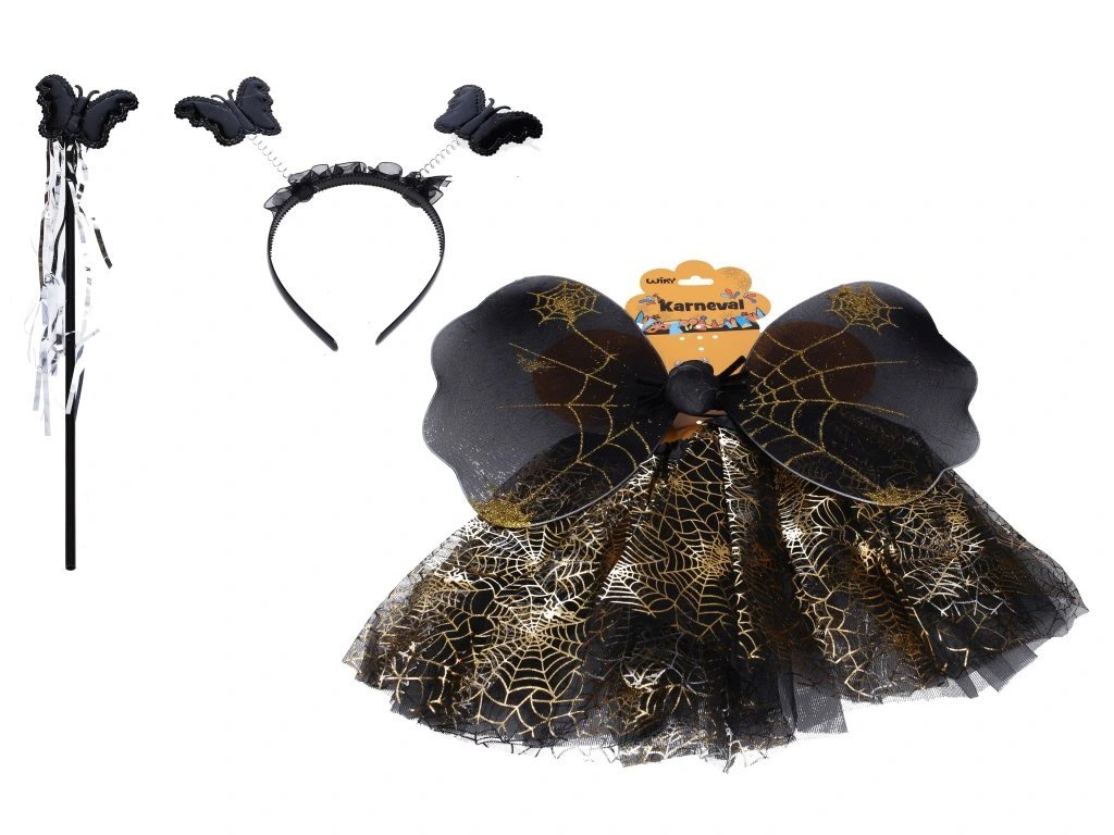 Černá motýlí křídla jsou výrazným vizuálním prvkem tohoto setu. Balení obsahuje křídla, sukně, hůlka a čelenka. Vhodné na karneval a maškarní.