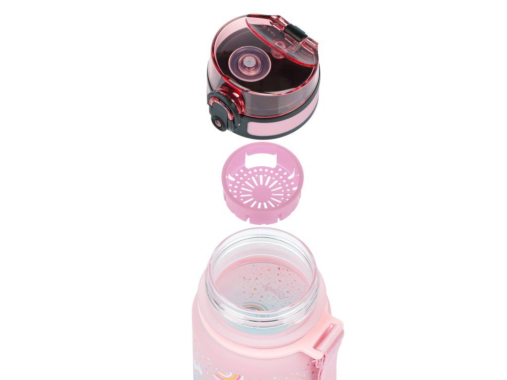 Barevná 350 ml lahev s duhovým vzorem, uzamykatelným víčkem a praktickým sítkem na ovoce nebo čaj.