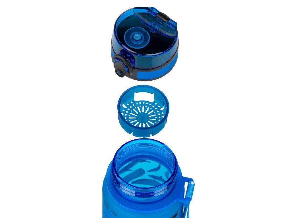 Modrá láhev s jemným motivem velryby a uzamykacím víčkem, která se neprohýbá a nevydává pach plastu.