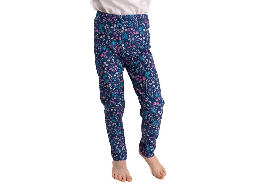 Jeansový vzhled s květinovým potiskem a pružným pasem pro snadné oblékání. Materiál je měkký a prodyšný, vhodný na celý den hraní i do školy.