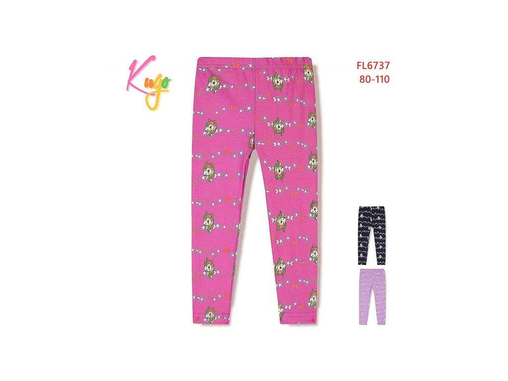 Roztomilý potisk jednorožců v sytých odstínech fialové, růžové a tmavě modré. Měkký elastický pas neškrtí a legíny jsou vhodné pro děti 80–110 cm.