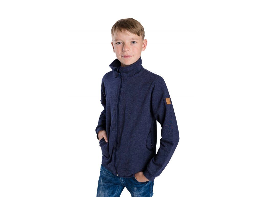 Melírovaný modrý úplet dává mikině jemnou textura, která dobře maskuje oděrky i šmouhy.