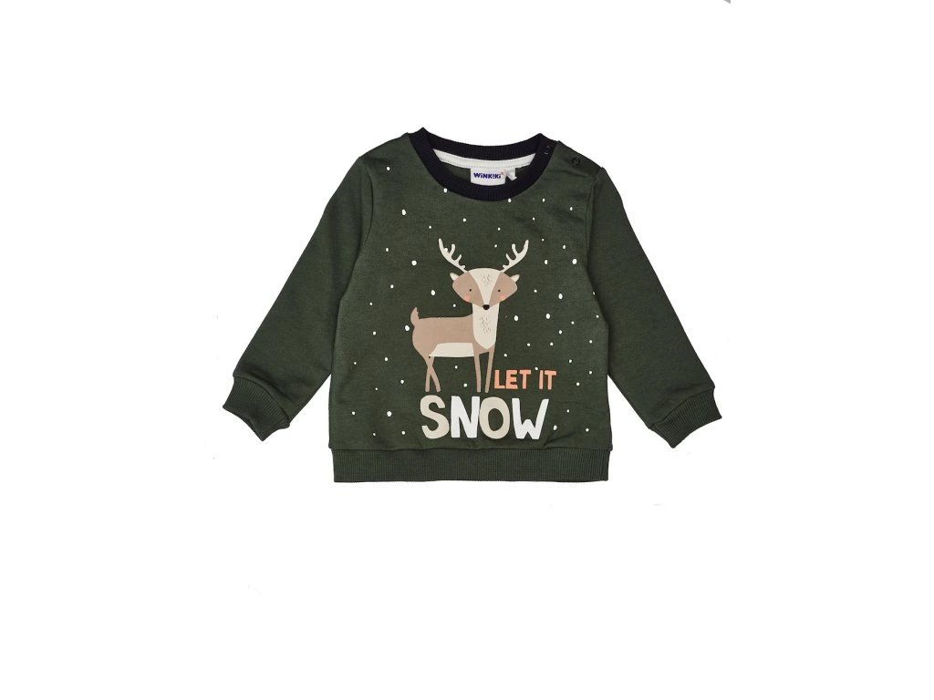 🧒 Mikina Snow – ideální volba pro malé chlapce, kteří chtějí zůstat v teple i během zimních dnů. Tato zateplená mikina v trendy khaki barvě je zdobená roztomilým jelenem, padajícím sněhem ❄️ a nápisem Let it Snow. Praktické zapínání na ramenním švu usnadňuje oblékání i svlékání.