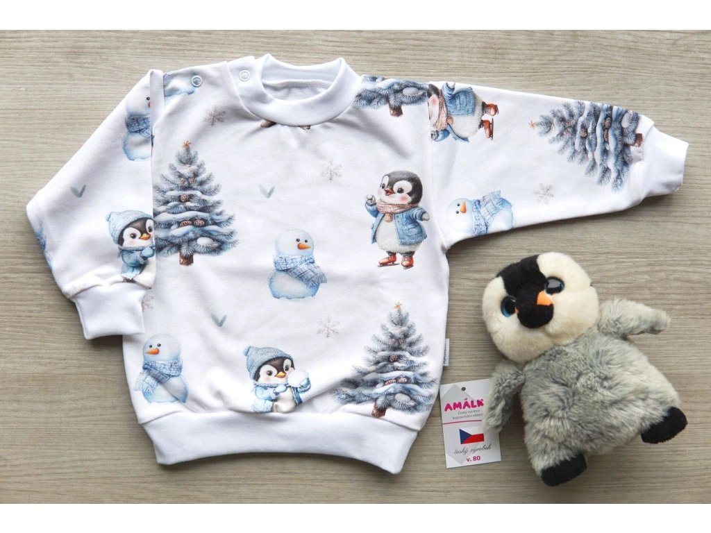 ❄️ Roztomilá mikina s kapucí z pružné a příjemné teplákoviny, která zahřeje vaše nejmenší během chladných dnů. 🎨 Originální digitální potisk s motivem tučňáka a sněhuláka v zimním lese dodá mikině jedinečný vzhled. 👶 U velikostí do 86 je krček opatřen praktickým zapínáním na baby patenty pro snadnější oblékání a sundávání. ✨ Rukávy a spodní část mikiny mají elastické náplety pro lepší přilnutí a komfort při nošení.
