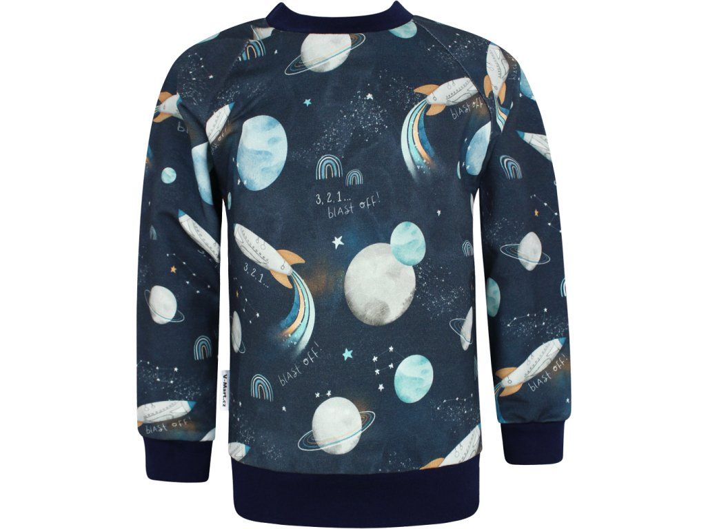 Tmavě modrý podklad s potiskem planet a raket je hlavní ozdobou mikiny. Barva zůstává sytá i po praní.