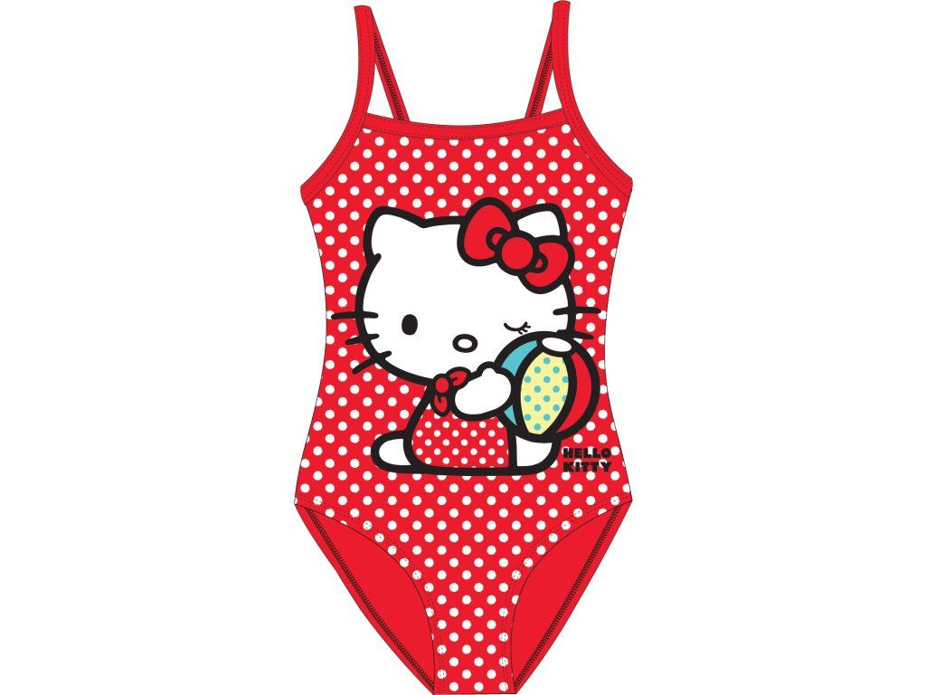 Červené plavky s bílými puntíky a Hello Kitty potiskem zaujmou hned na první pohled; vzor je hravý a snadno rozpoznatelný.