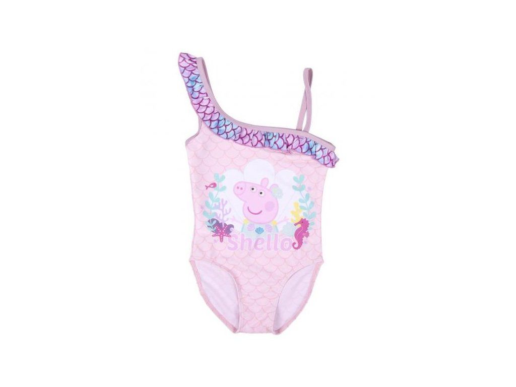 - 🎨 Vzor: růžový odstín s jemným vzorem šupin a potiskem Peppy, asymetrické ramínko s volánkem.