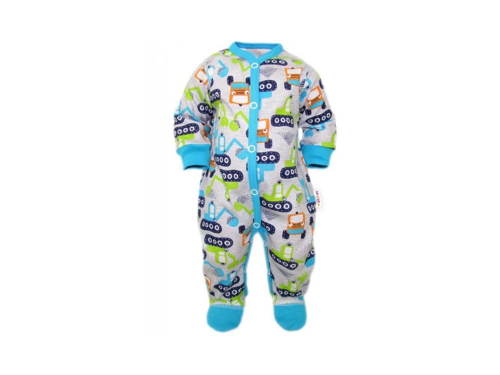 Hravý motiv bagrů na měkké 100% bavlně — pyžamko, které je šetrné k citlivé pokožce kojence a má praktické zapínání na patentky pro rychlé přebalování. Materiál je měkký a prodyšný.