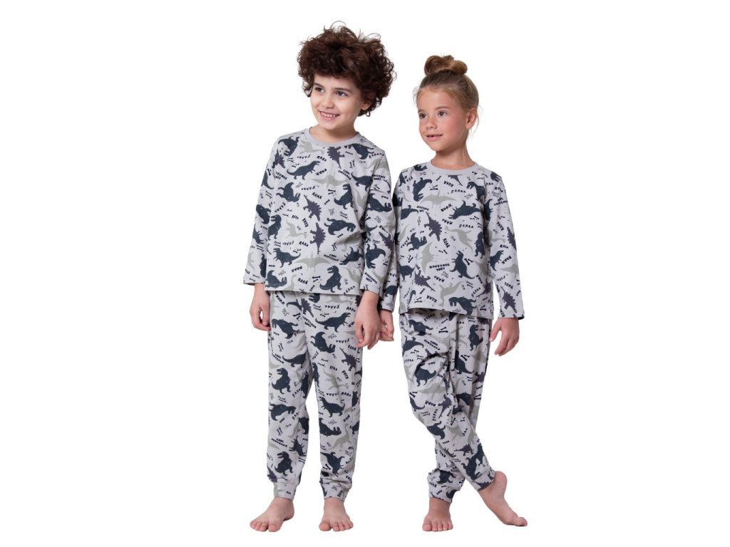 Objevte pohodlí a zábavu s naším chlapeckým (a dívčím) pyžamem Dino! Tento stylový set obsahuje dlouhé kalhoty a tričko s dlouhým rukávem v módní béžovo-modro-šedé kombinaci, která potěší každého malého dobrodruha ve věku 4 - 7 let.
