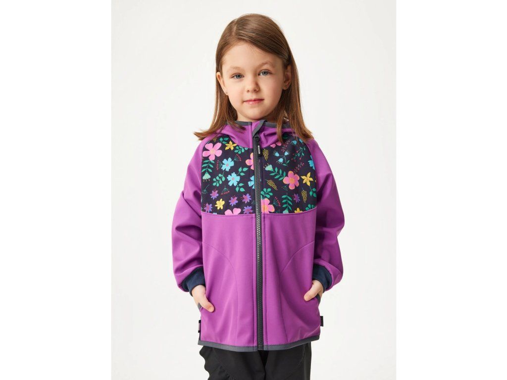 Ostružinová softshellová bunda s drobným kytičkovým potiskem je lehká, pružná a příjemná na dotek. Materiál s polyuretanovou membránou chrání proti větru a lehkému dešti, náplety z bavlny s elastanem neškrtí v pase ani na rukávech.