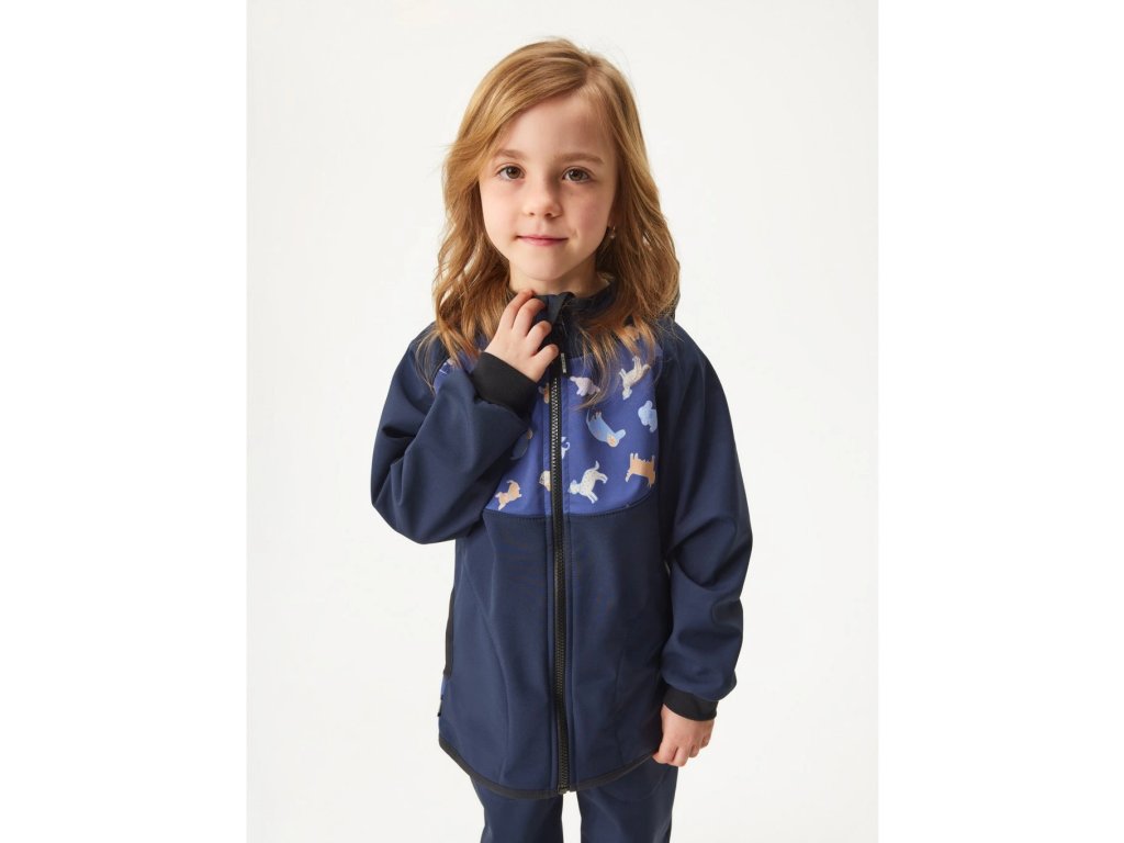 Objevte dokonalou kombinaci pohodlí a ochrany pro vaše děti s naší zateplenou softshellovou bundou zdobenou roztomilým potiskem pejsků. 🐶