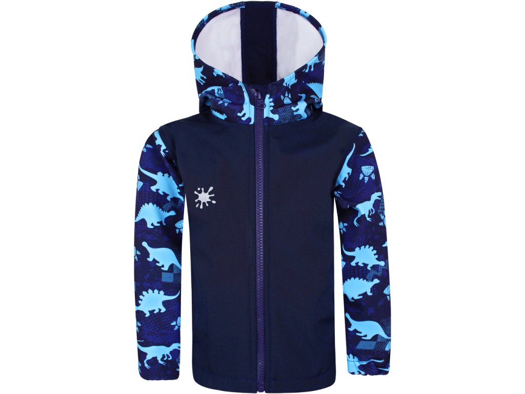 🌧️ Hlavní části bundy jsou z jednobarevného softshellu, rukávy, kapuce a boční části jsou potištěné motivem dinosaurů.