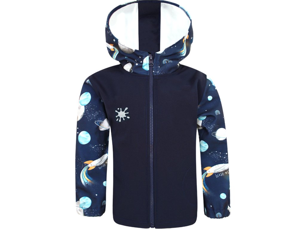 - 🧥 Kombinace potištěného a jednobarevného softshellu s motivem vesmíru