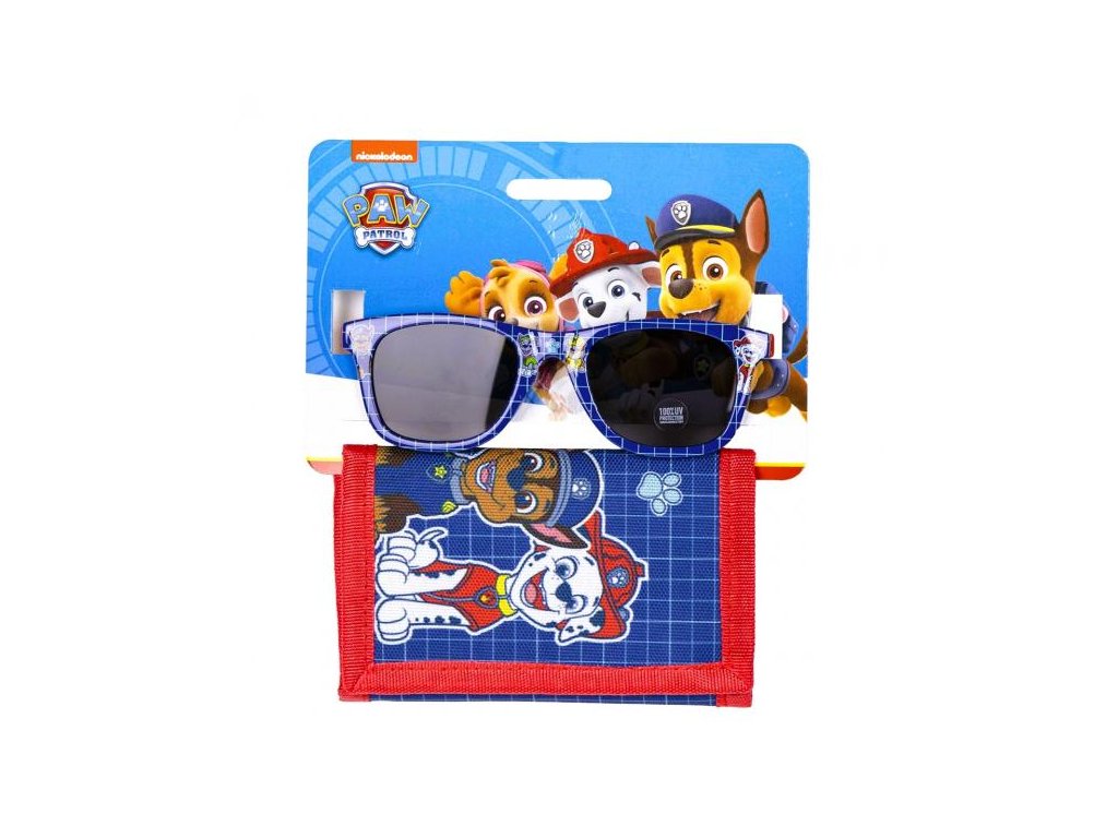 Sada obsahuje dětské sluneční brýle s 100% UV ochranou a pevnou modrou peněženku s motivem Tlapkové patroly.