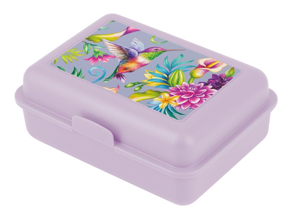 Fialový svačinový box s motivem kolibříka a dělicí přepážkou pro oddělení různých potravin.