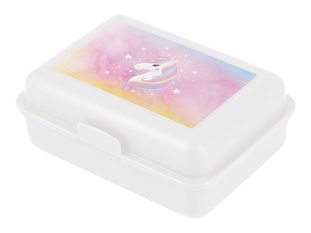 Lehký plastový box v bílé barvě s motivem jednorožce a dělicí přepážkou – ideální na sendvič a ovoce. Objem 1,3 l, rozměry 17,8 × 12,2 × 6 cm; uzavírá se bezpečnostním zámkem, takže svačina zůstane přehledná a pevně uložená.