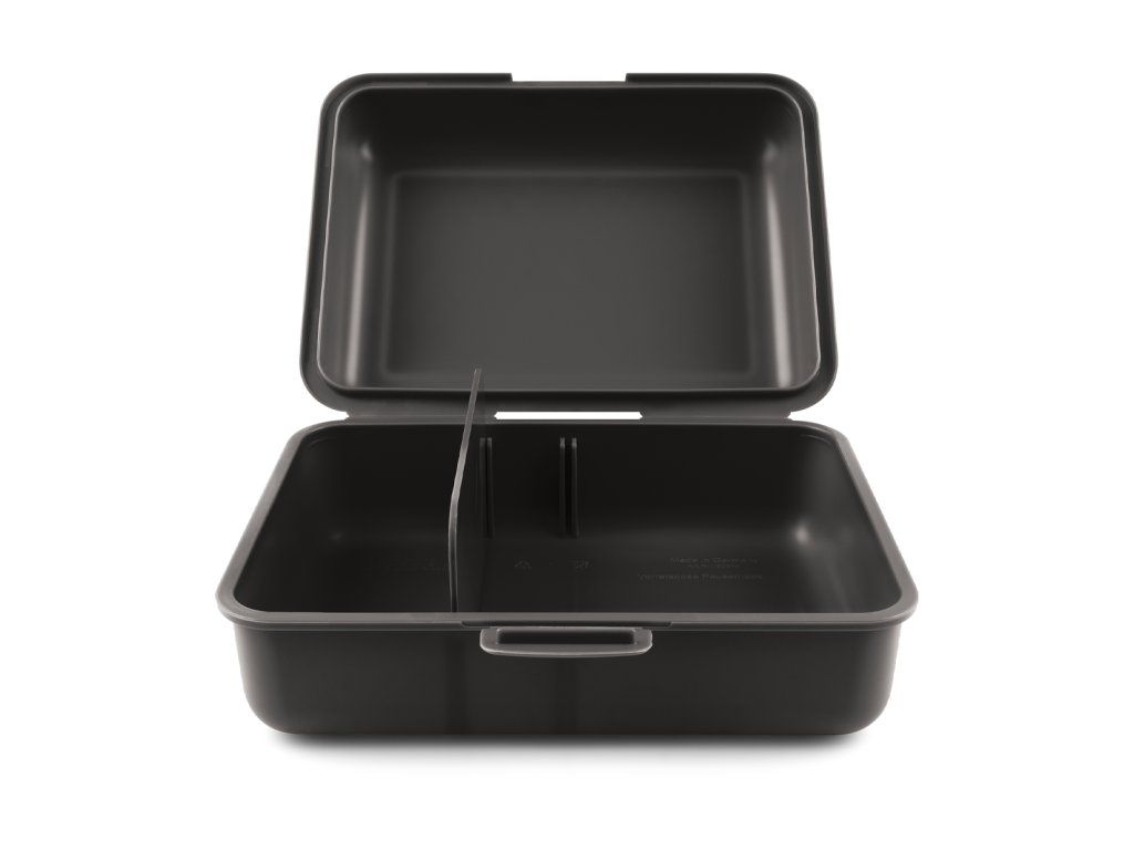 Černý plastový box s dělicí přepážkou pro přehledné balení svačiny. Materiál PP je lehký, neprůhledný a bezpečný pro potraviny.