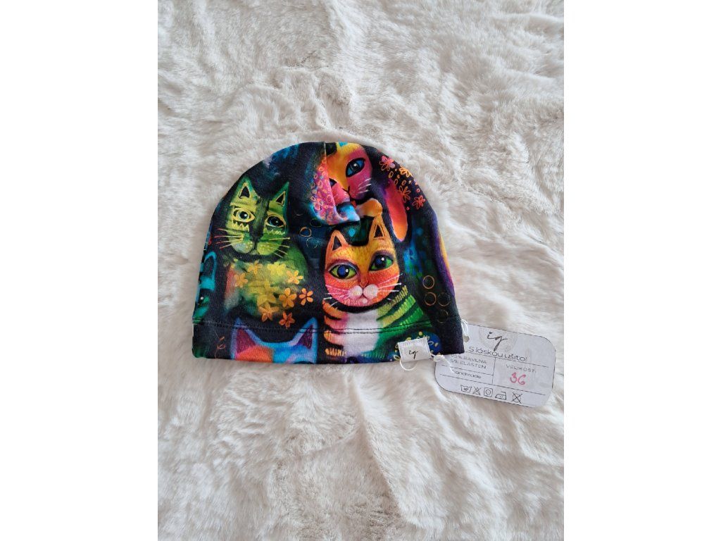 Veselý a barevný motiv kočiček je hlavním vizuálním prvkem čepičky.
