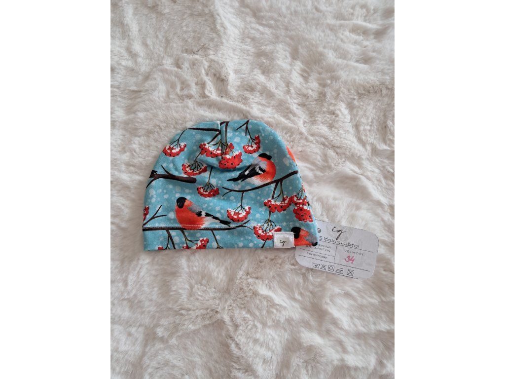 - 🧵 Vzor: drobní ptáčci, tisk rovnoměrně rozložený po celé čepičce, decentní barevné tóny vhodné k většině kojeneckého oblečení.