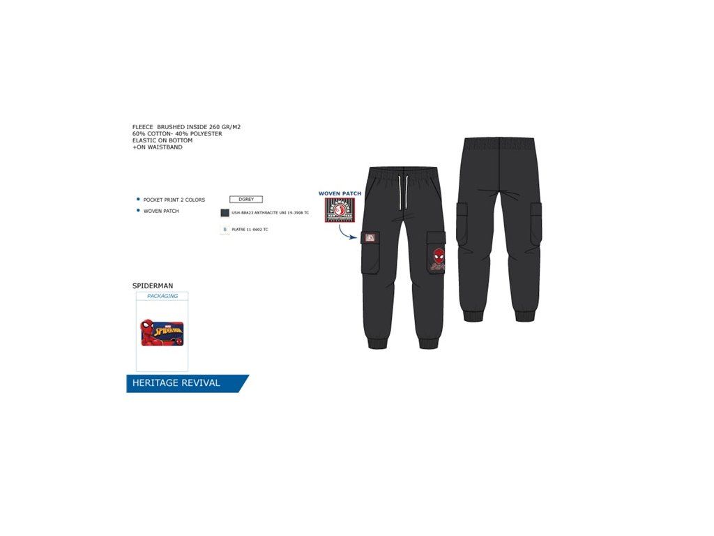 Tmavě šedé cargo tepláky s potiskem Spidermana a praktickými kapsami pro malé objevitele. Materiál má krátký chloupek a neprosvítá.