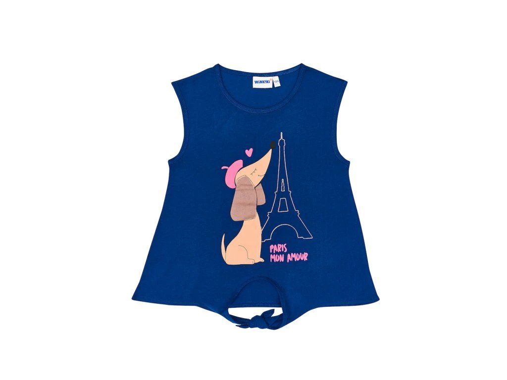 Navy barva s předním uzlem a hravým motivem Paříže dělá z tílka výrazný letní kousek. 100% bavlna je prodyšná a jemná k dětské pokožce, hodí se na lítačku i parné dny.