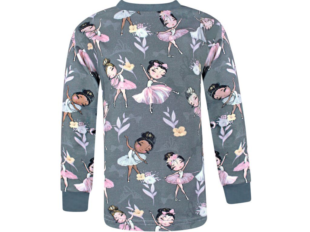 Tmavě šedé tričko s potiskem usměvavých baletek je první věc, kterou si maminka všimne. Vzor dodává dětskému outfitu hravost bez zbytečného kýče. Materiál je měkký a prodyšný.