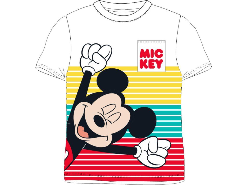 Barevné proužky a velký potisk Mickey Mouse jsou hlavním vizuálním prvkem tohoto trička.