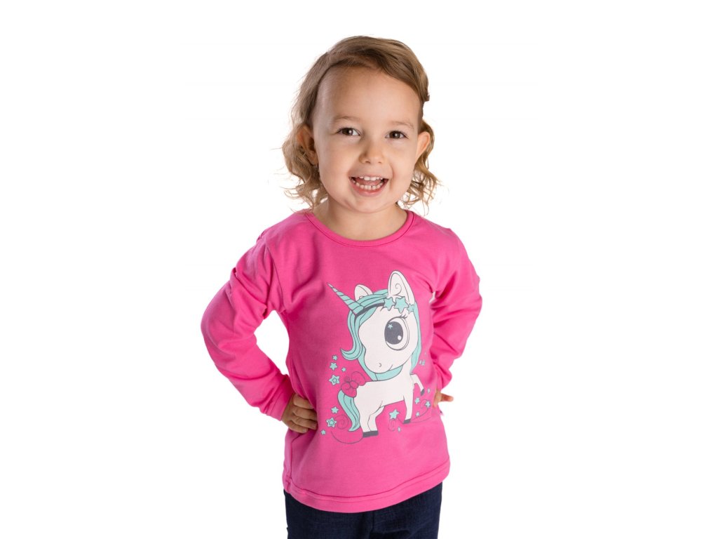 🌸 Roztomilé dívčí tričko s dlouhým rukávem v hravé růžové barvě s motivem jednorožce, které potěší každou malou princeznu.