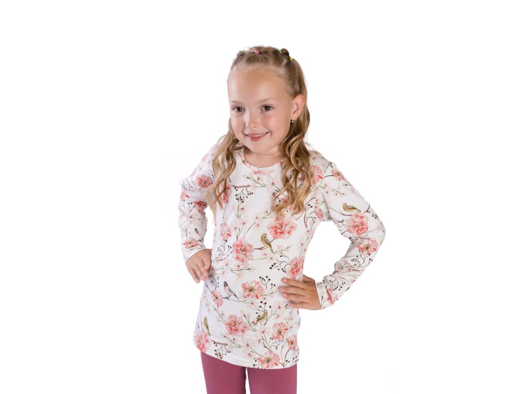 Dětské tričko s dlouhým rukávem s krásným motivem jemných květin a roztomilých ptáčků. Vyrobeno z vysoce kvalitní bavlněné směsi s příměsí elastanu pro maximální pohodlí a volnost pohybu. 👧✨