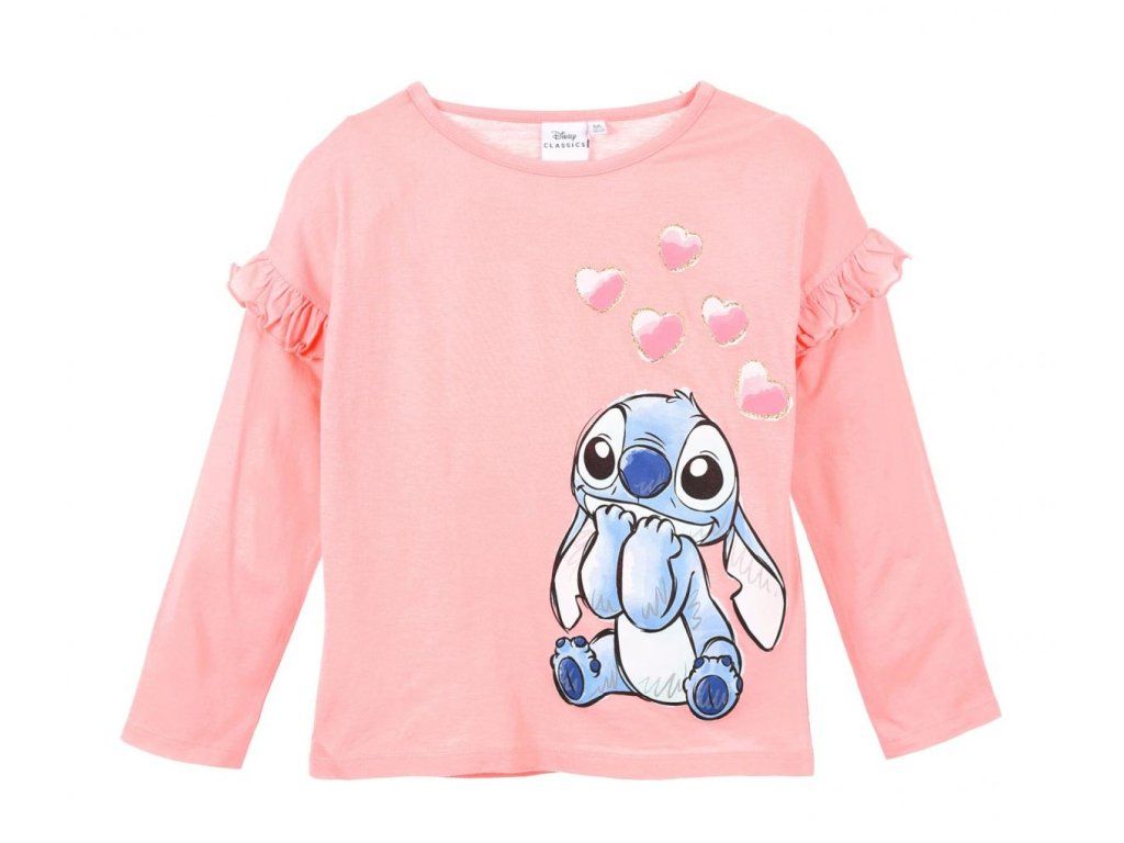 Růžové triko s velkým potiskem Lilo a Stitch a dlouhým rukávem; příjemné na dotek díky 100% bavlně. Vhodné do školky i na lítačku na hřišti.