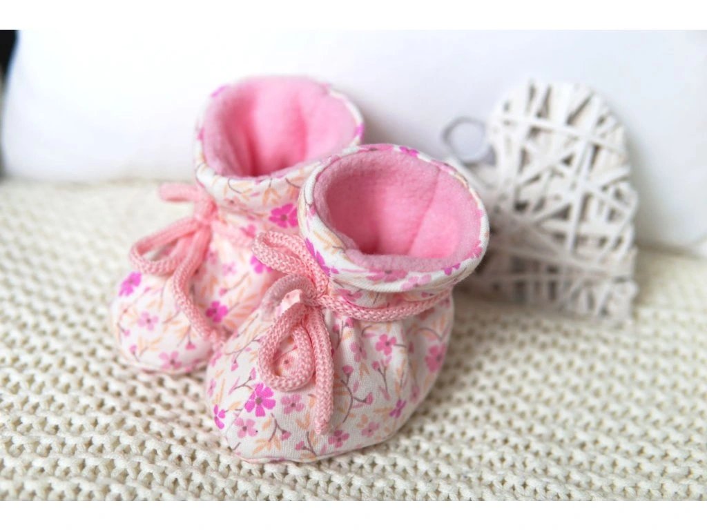 Tyto roztomilé a teplé dětské bačkůrky jsou ideální pro ochranu nožiček vašeho miminka před chladem. Vyrobeny z měkké 100% bavlny s jemným oboustranným tiskem květinek 🍃 a uvnitř podšity příjemným růžovým fleecem pro maximální pohodlí a teplo. Díky praktickému zavazování na šňůrky se bačkůrky dobře přizpůsobí nožičce a zajistí, že dobře drží. Perfektní volba na chladnější dny! ❄️👶