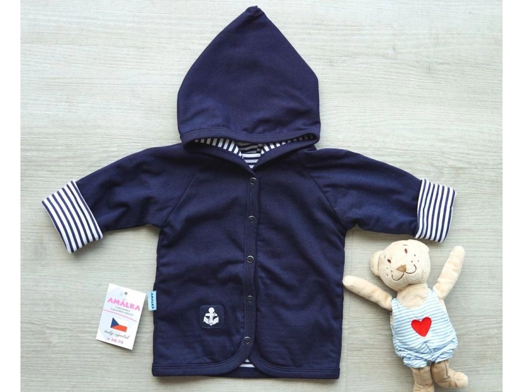 Vychutnejte si pohodlí a teplo s naším kvalitním celopodšitým, dvojitým bavlněným kabátkem s kapucí pro Vaše miminko. 🌟 Kabátek je ozvláštněn kouzelným pruhovaným potiskem v bílé a temně modré barvě, doplněným o elegantní vyšitou aplikaci kotvičky. 💙